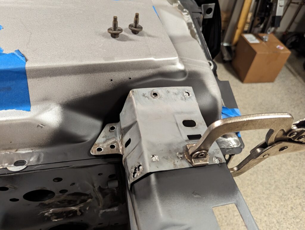 With the cowl complete I was able to reinstall the apron extensions that tie the top of the engine bay aprons to the top of the cowl. I had ordered replacements for these since they weren’t expensive, but after test fitting the reproductions against the originals I decided to clean up and reuse the originals.